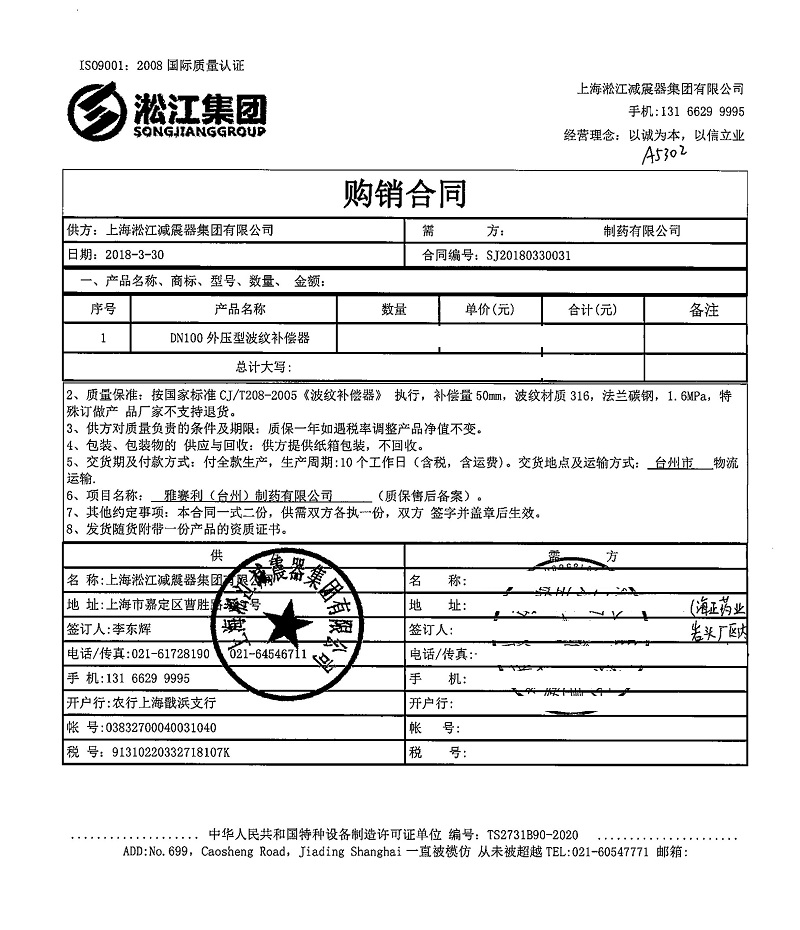 上海淞江減震器集團(tuán)有限公司為您介紹:雅賽利(臺(tái)州)制藥有限公司波紋補(bǔ)償器購(gòu)銷(xiāo)合同信息,淞江集團(tuán)銷(xiāo)售在2018年4月3日簽下雅賽利制藥有限公司的合同,為該項(xiàng)目提供波紋補(bǔ)償器產(chǎn)品。