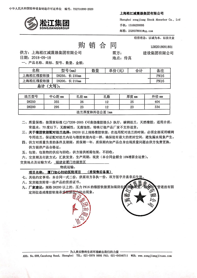 上海淞江減震器集團(tuán)有限公司為您介紹:廈門如心婦幼醫(yī)院橡膠軟接頭項(xiàng)目信息,淞江集團(tuán)銷售在2018年9月18日簽下該合同,為廈門如心婦幼醫(yī)院提供橡膠軟接頭產(chǎn)品。