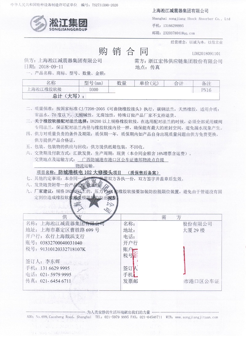 防城港核電102大修橡膠軟接頭合同介紹: